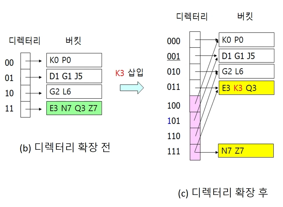 - 확장해싱에서는 버킷에 오버플로우가 발생하면 새 버킷을 만들어 나누어 저장하며 이때 이 버킷들을 가리키던 디렉터리는 2배로 확장
