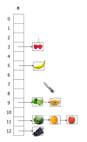 // 배열의 원소에는 연결리스트 Node를 가리키는 레퍼런스 저장