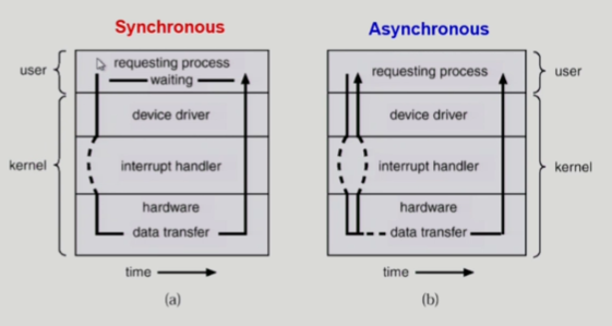 ⇒ 프로세스가 입출력을 실행하지 않고 기다리면 동기식, 입출력 요청하고 바로 instruction을 실행하면 비동기식