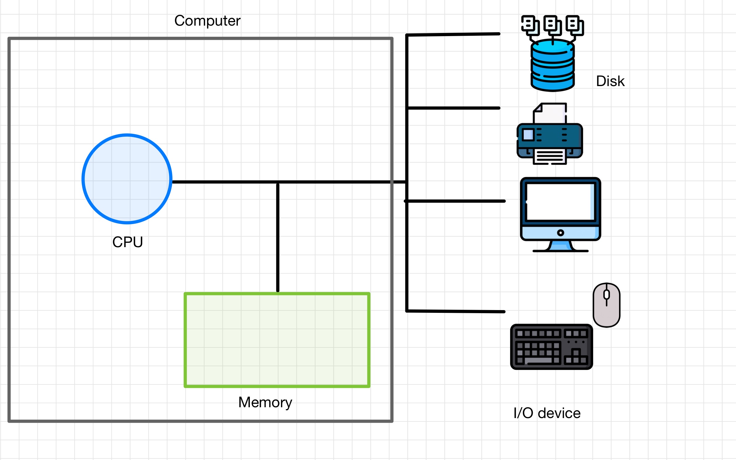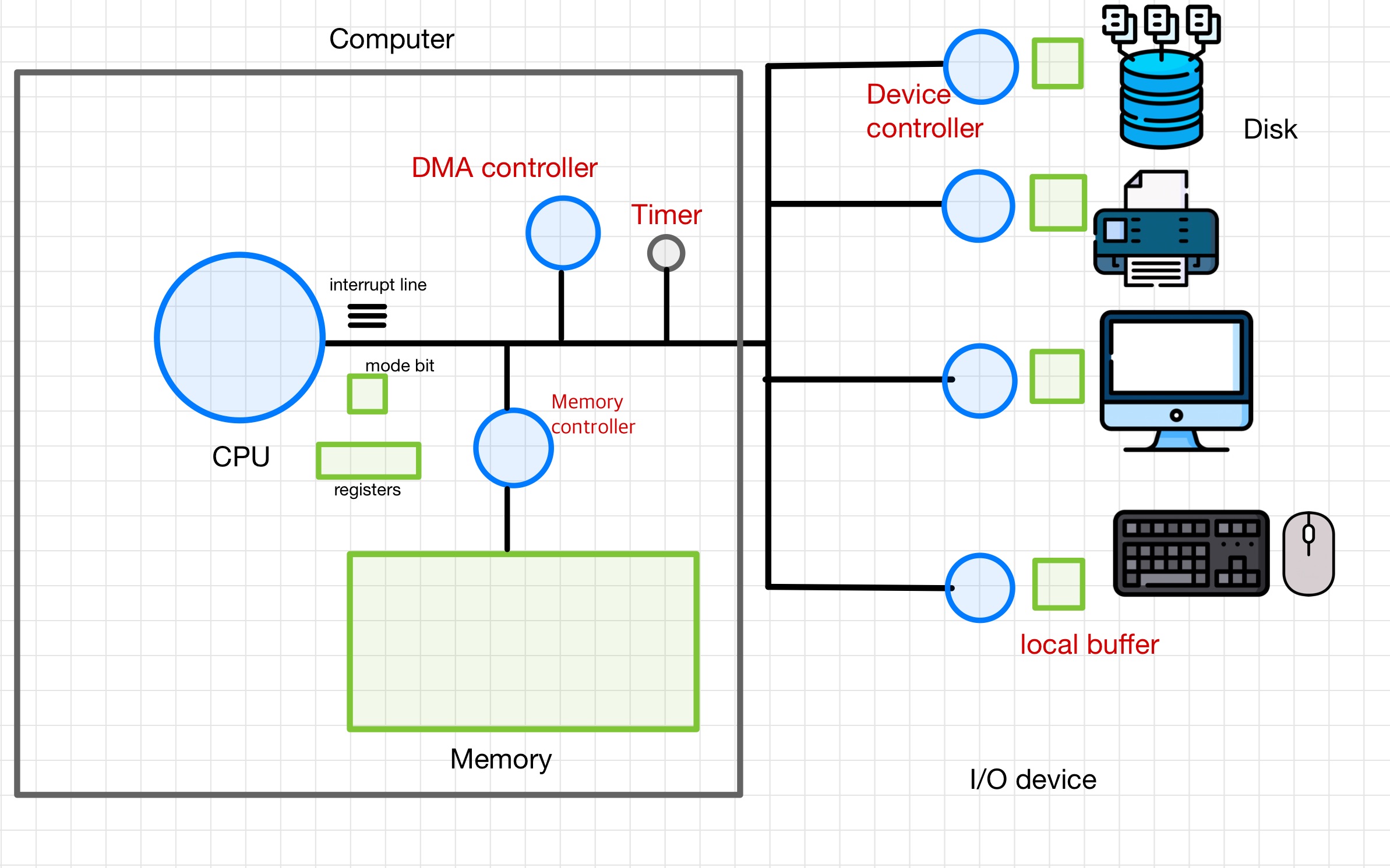 interrupt line : CPU는 항상 메모리에 있는 instruction만 실행하는데, 키보드에서 입력이 들어왔다든지, 디스크에서 무엇을 읽어와야 된다든지, 디스크에 무언가를 읽어오라고 요청했는데 이 일을 다 끝냈다든지 CPU가 알 수 있도록 그것을 전달하고 받기 위해 interrupt line이 존재