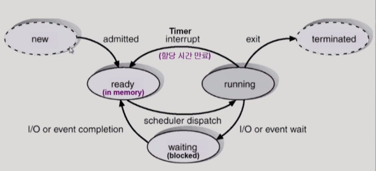 - Running: CPU를 잡고 instruction을 수행 중인 상태