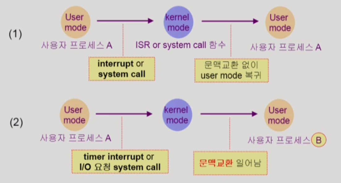 - System call이나 Interrupt 발생 시 반드시 context switch가 일어나는 것은 아님