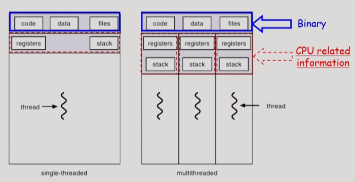 - Thread 하나가 코드 어느 부분을 실행하다가 함수 호출하면, 그 함수를 호출하고 리턴한 정보를 스택에 쌓는데 CPU 수행단위마다 스택을 별도로 쌓음