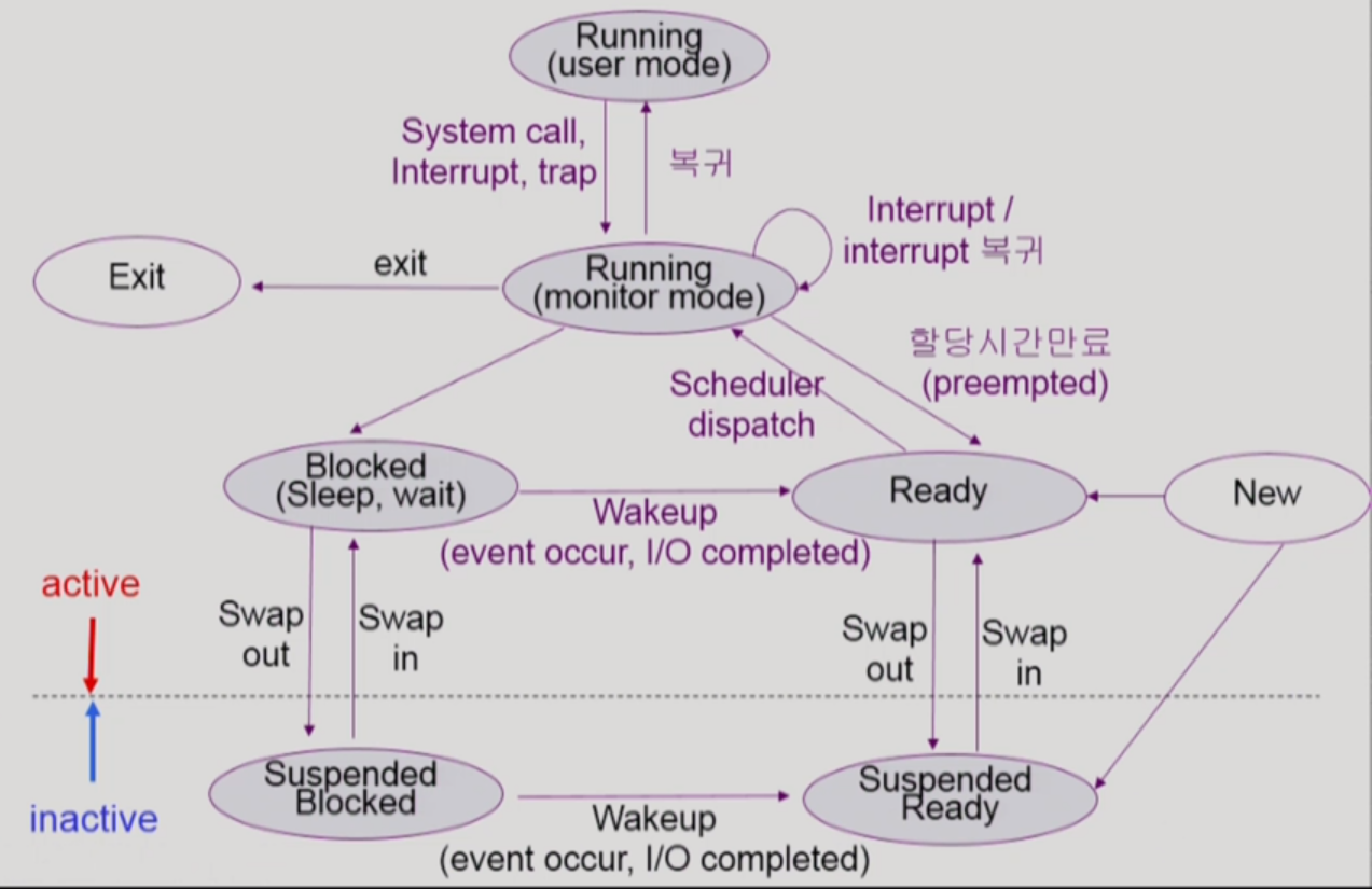 - runnig (monitor mode) : 프로세스가 실행되다가 인터럽트가 들어오면 운영체제가 코드 실행 (프로세스가 커널 모드에서 실행)
