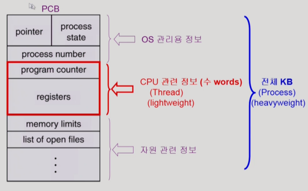 더불어 문맥교환 (프로세스a → 프로세스b)은 오버헤드가 상당히 크지만 프로세스 내부에서 스레드간 CPU switch 일어나는 것은 간단 (대부분 문맥 그대로 사용)